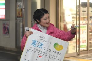 日本共産党滋賀県委員会が呼びかけた「#わたし戦争とめにいくわ 緊急アクション」が27日、大津市のJR石山駅前でありました。「変わるのは憲法じゃなくて政治だ」とアピールし、「日本国…