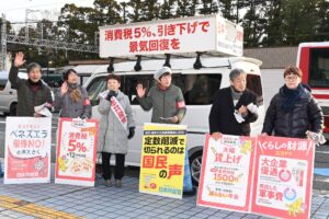 日本共産党の節木三千代滋賀県議は15日、大津市役所前で宣伝し「日本共産党を伸ばして消費税5%への減税を実現しよう」と訴えました。杉浦智子、林まり、小島義雄、柏木敬友子の各市議、立…