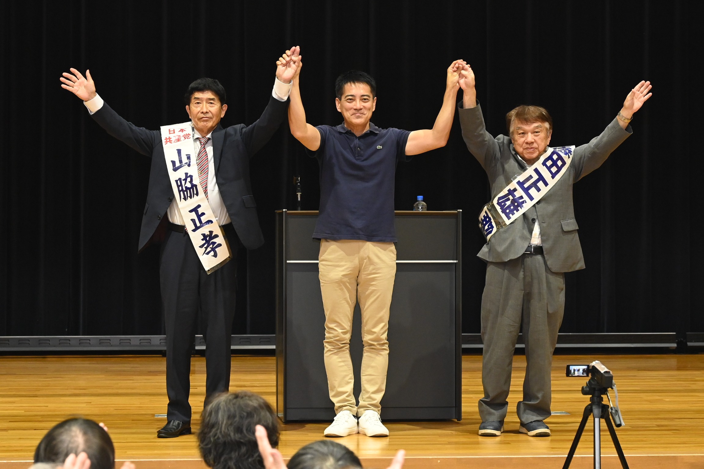 山脇正孝市議は「物価高騰に苦しむ市民生活を支える施策の実現をめざす」と表明。藤田正雄市議は「子育てや医療・介護の問題を一生懸命取り組んでいきたい」と述べました。