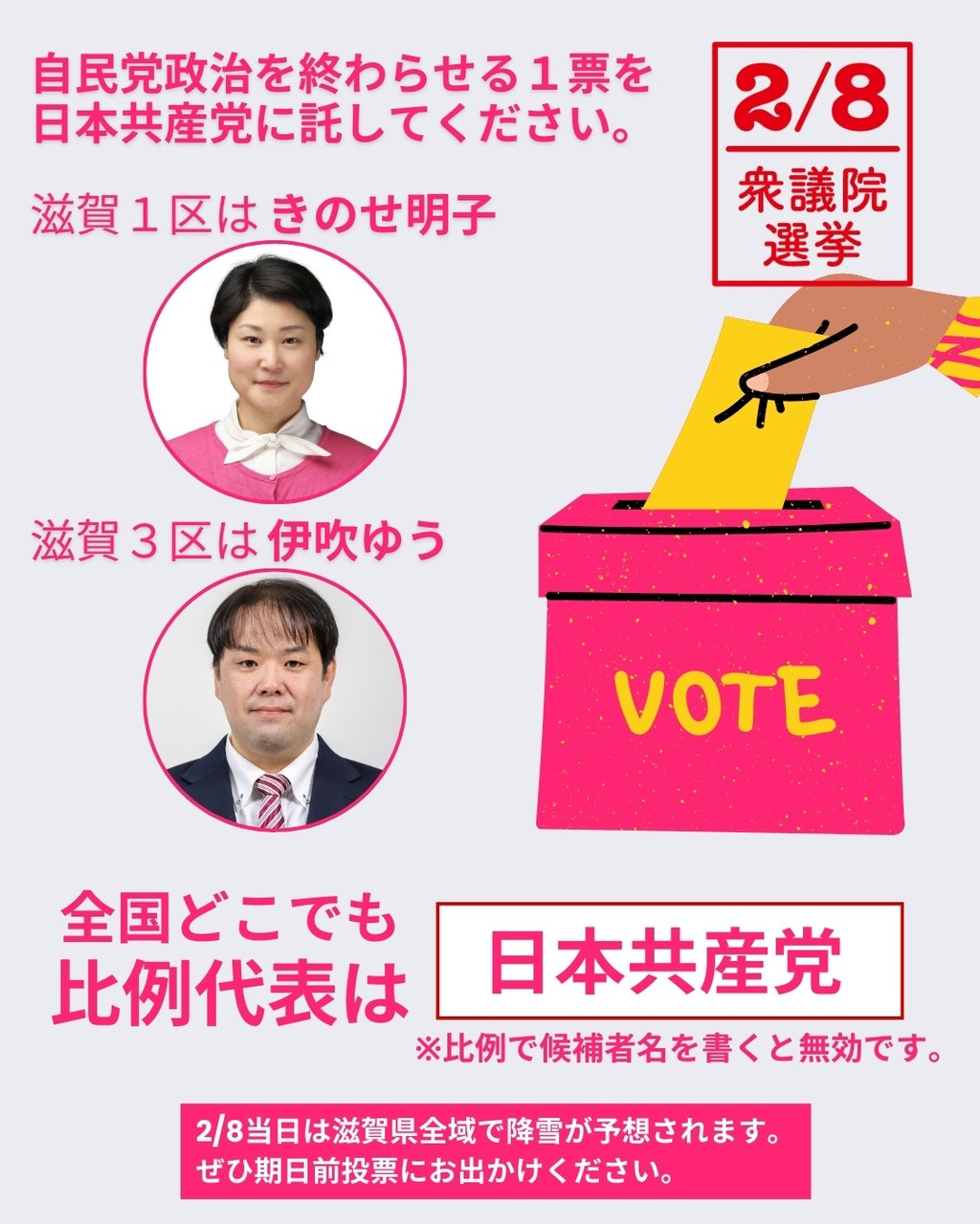 2026.02.07 比例は日本共産党 滋賀1区は きのせ明子 滋賀3区は伊吹ゆう 選挙 比例代表は「日本共産党」と書いてご投票ください。滋賀1区は「きのせ明子」、滋賀3区は「伊吹ゆう」をよろしくお願いします。 Tweet