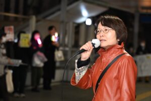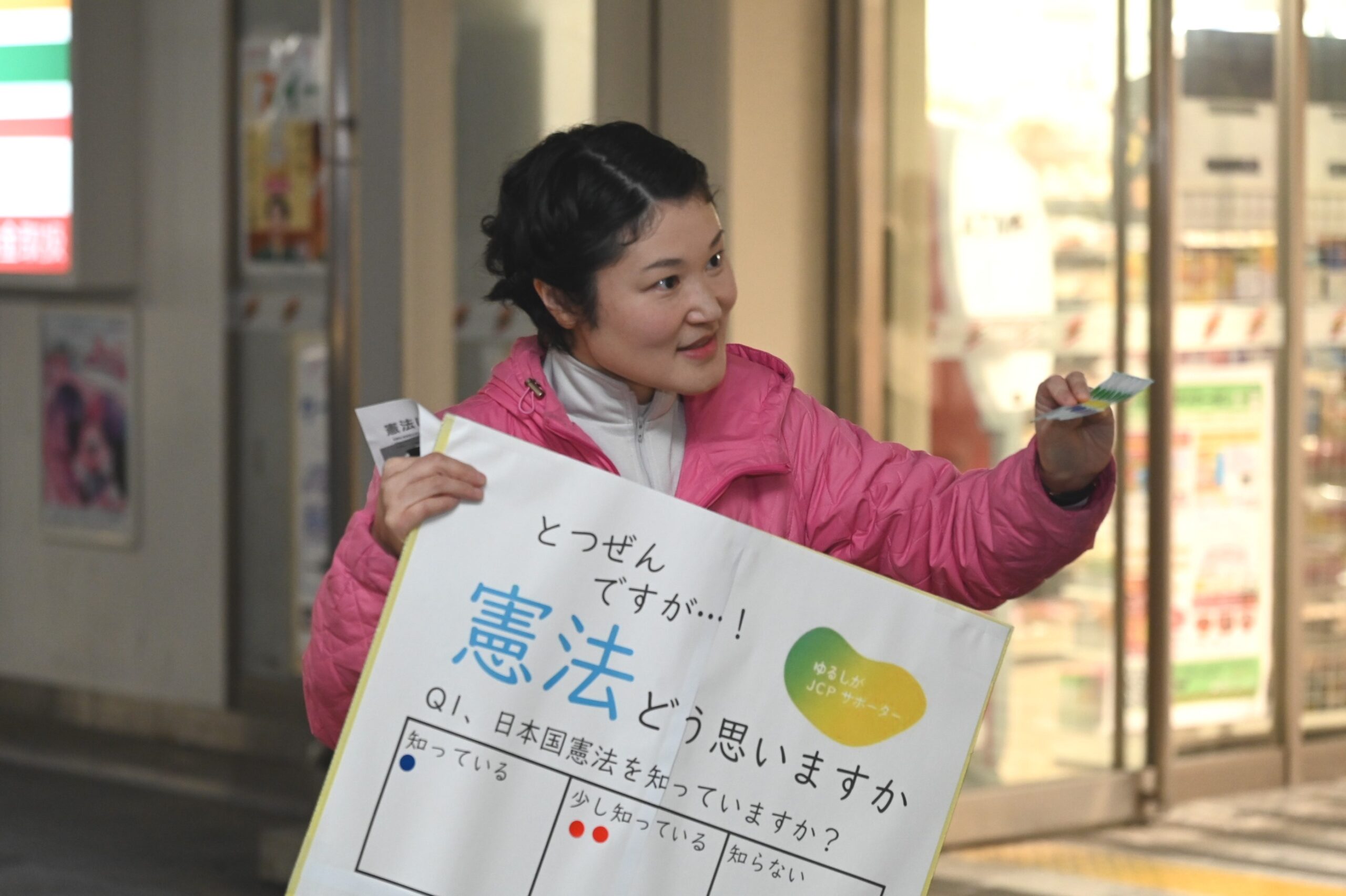 黄野瀬明子党県常任委員は、憲法改正の賛否を問う国民投票にまで踏み込んだ高市首相の発言を批判し、「国会にお任せということにしてはならない。国民一人ひとりに問われる問題だ」と訴えました。