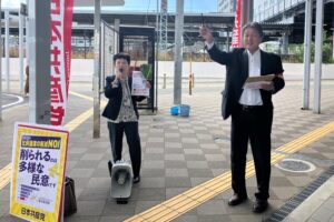 日本共産党は12日、近畿いっせい宣伝に取り組みました。滋賀県野洲(やす)市のJR野洲駅北口では、工藤よしあき、野並きょう子の両元市議らが宣伝し、物価高から暮らしを守るために「消費…